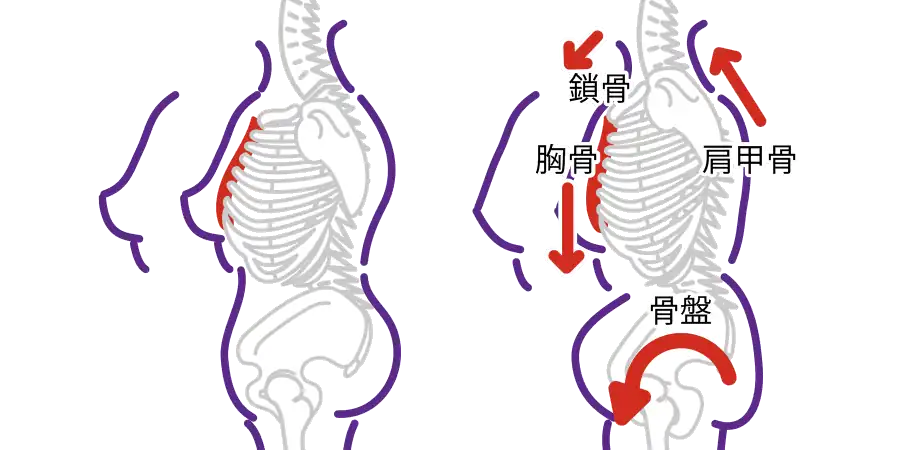 骨盤が前傾して反り腰になると、胸骨は下がり鎖骨は引っ張られ肩甲骨は上がり、猫背や巻き肩になってしまいます。背中が丸まった状態になれば、乳房は当然下を向き、バストは左右に広がり立体感がなくなります。