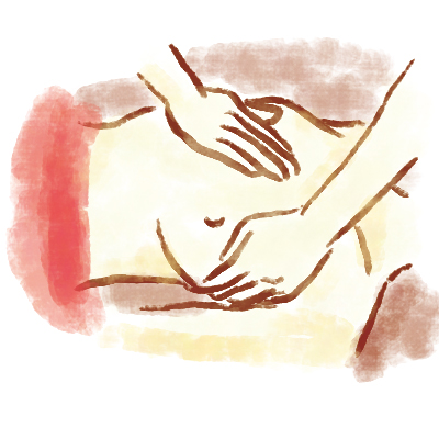 マンモ・リラクゼーション:胸部・肋骨/腹部・腸骨を追加ケアし、全身の体液循環を改善してホルモンバランスをとり、全身の状態を良い方向に導く専門技術です。 *マンモ(mammo)…乳房